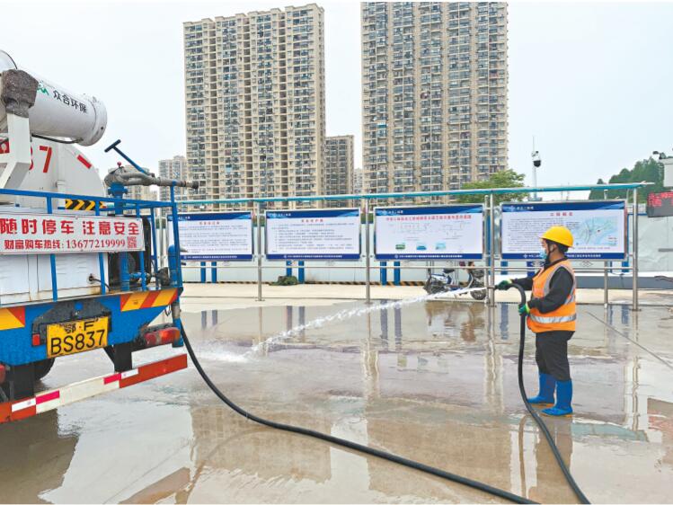 步入武汉长江新区起步区新区大道项目工地,一台洒水车、3名保洁员正在对硬化路面进行冲洗,每天有15名工人专门负责现场保洁、垃圾清理、材料分区等工作;渣土车经过洗车槽,红外线感应的冲洗装置可自动冲洗,还配置了洗轮机,防止车辆带泥上路;现场的裸土区域全部用绿色密目网覆盖。在道路一侧,扬尘噪声监测系统实时显示PM2.5、噪声、温湿度等数值,以此为依据,线性布置的喷淋系统可实时开启,喷水降尘。技术质量部负责人张尚智介绍,“在基坑附近还设置了雾炮机,随时准备在开挖作业时喷水压尘。”