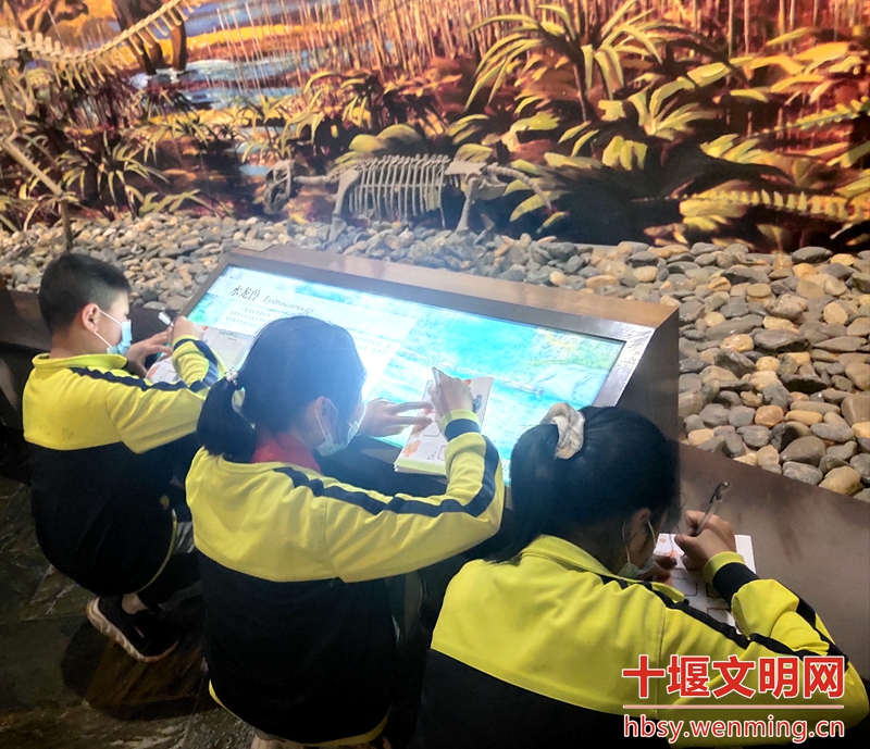 研究完恐龙的相关知识,学生们认真记下笔记。图片来源:十堰文明网