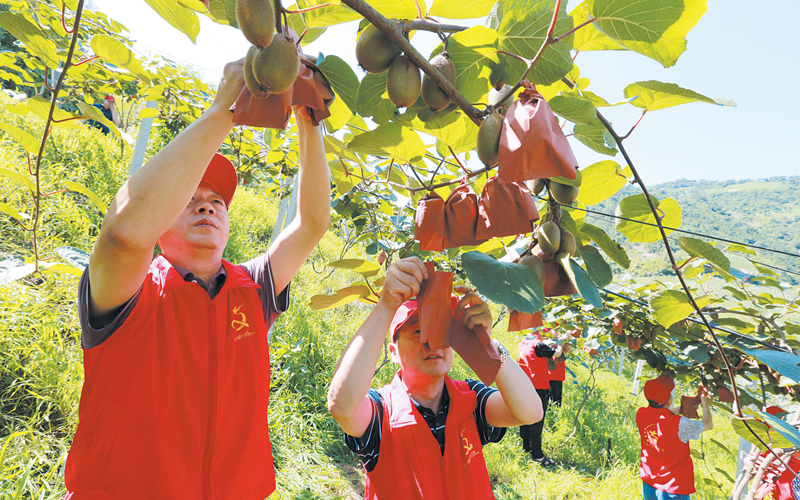 2021年7月13日,竹山县市场监督管理局组织党员志愿者走进官渡镇蒲溪村,帮助敦江猕猴桃生态种植专业合作社为猕猴桃套袋。该局通过开展“八个一”活动,使结对共建和精神文明建设落地生根、开花结果,助力乡村振兴。图/朱本双 陈伟