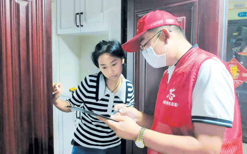 2021年8月13日,十堰日报社志愿者深入张湾区汉江路街道七里社区神定澜湾小区,开展文明创建志愿服务及疫情防控宣传活动。图/王艳菊