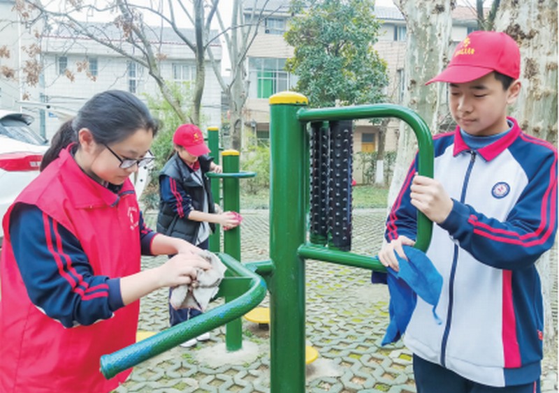 4日,铁山街道新村社区联合铁山一中志愿者开展学习雷锋志愿服务活动。志愿者们集中对辖区健身器材、公共座椅、扶栏进行清洗,用实际行动为社区居民打造舒适的居住环境。记者 鄢巍 通讯员 梅洁 摄