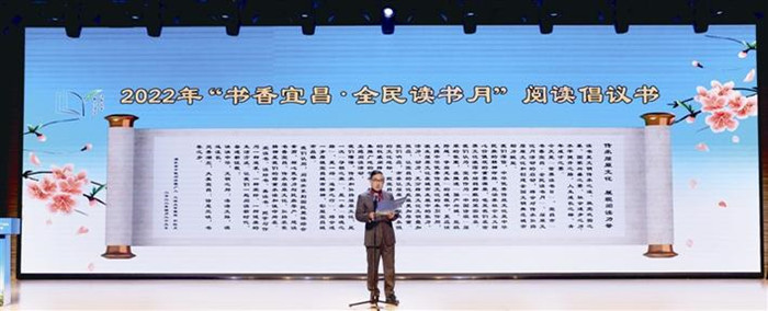 4月23日,2022年“书香宜昌·全民读书月”活动启动,全省十佳阅读推广人、三峡大学教授彭红卫宣读阅读倡议书。 记者王昌明 摄