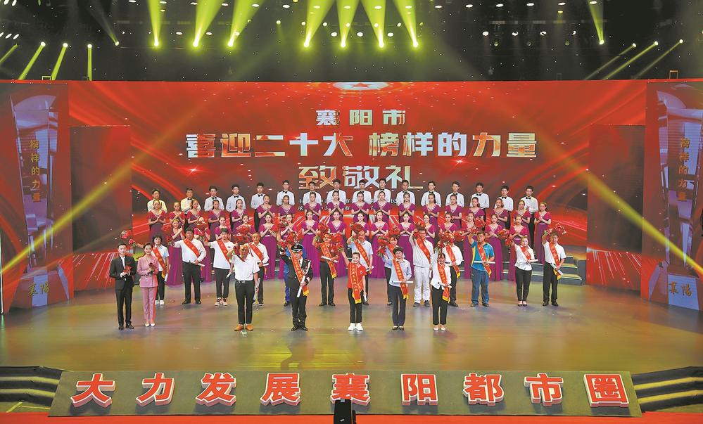 在主题曲《榜样的力量》的嘹亮歌声中,先进人物代表上场接受致敬、合影,“喜迎二十大 榜样的力量”致敬礼圆满结束。(襄阳日报 全媒体记者韩犁夫)