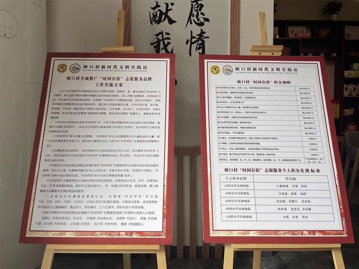 据了解,峡口村结合本村实际,将“时间存折”志愿服务活动与人居环境整治、疫情防控、社会治理、产业发展等多方面工作相融合,对村民日常生产生活中的文明行为进行积分管理。